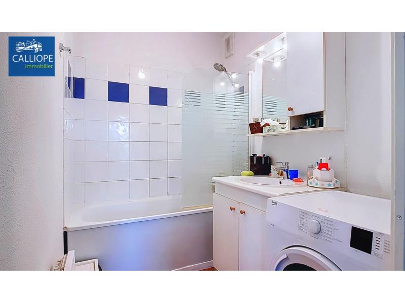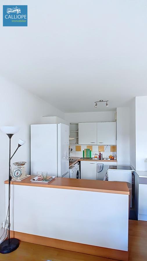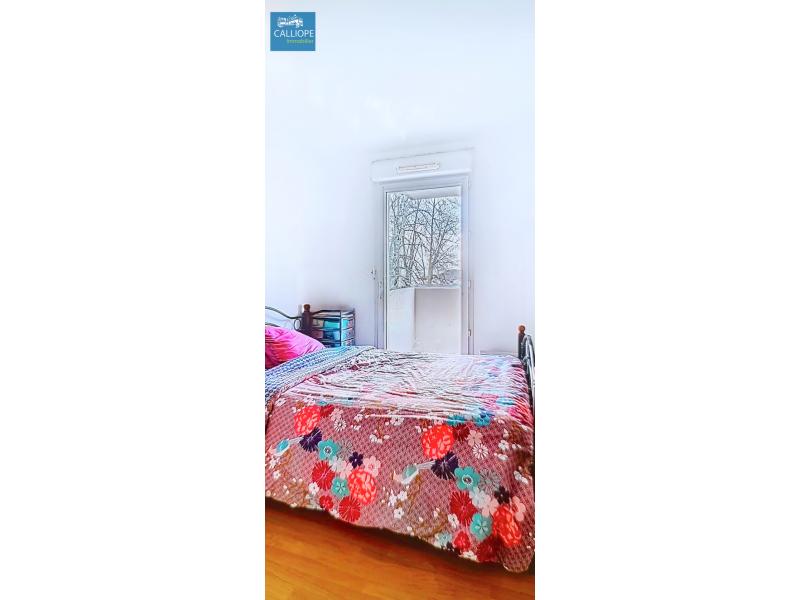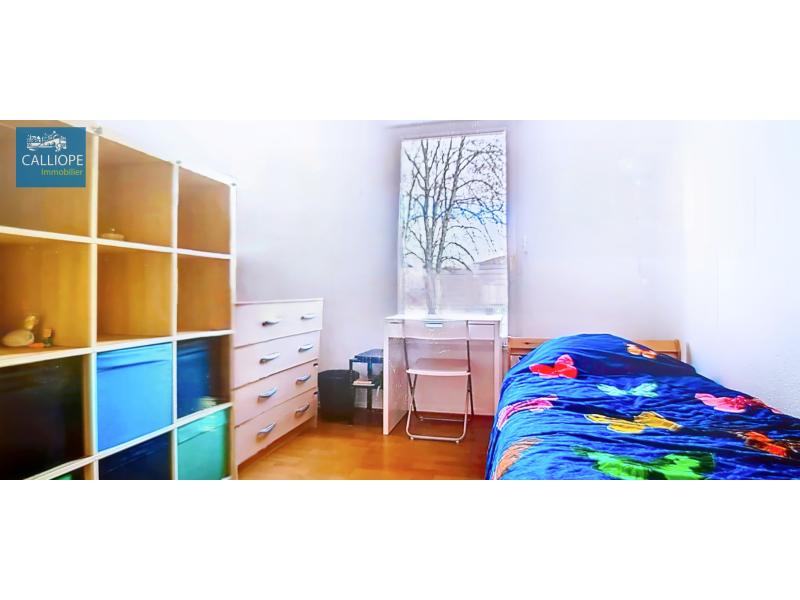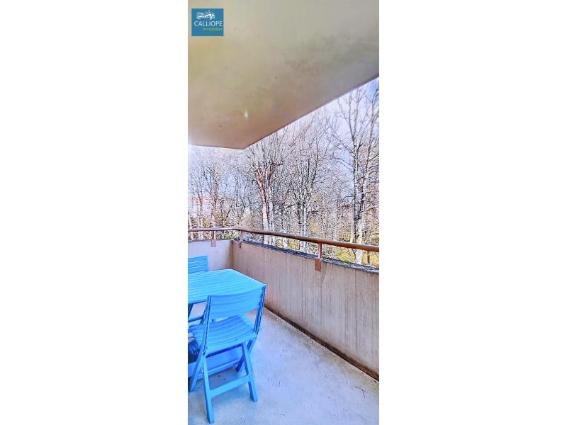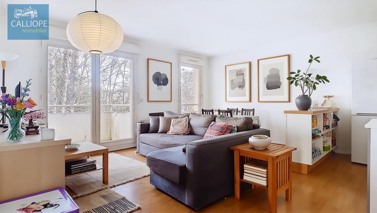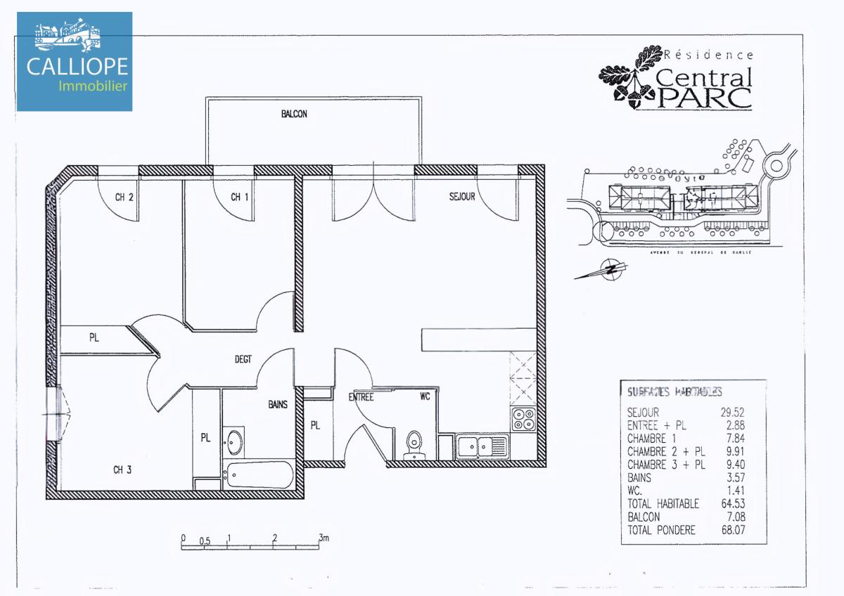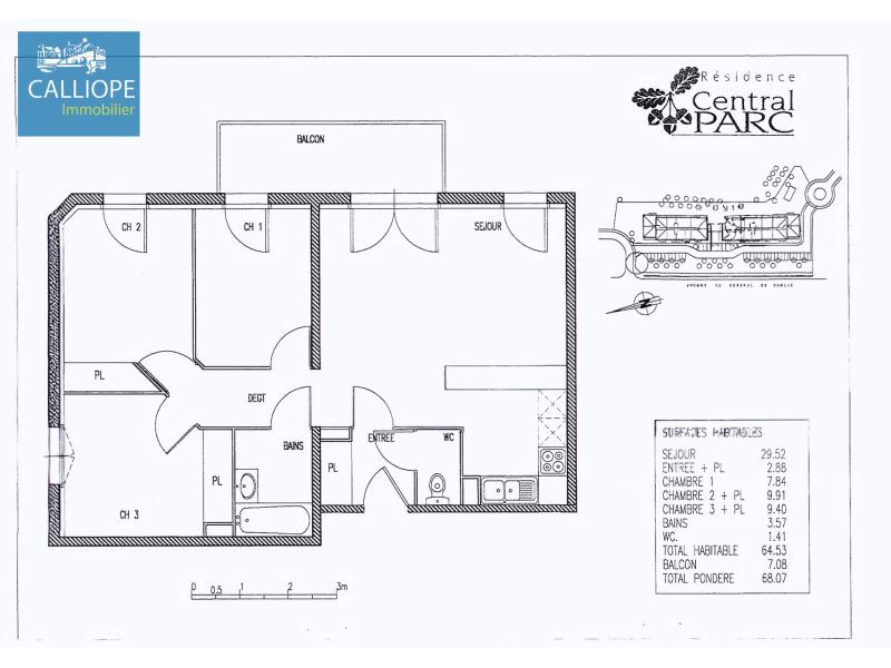 1 entrée avec placard, 1 séjour avec coin cuisine aménagé, 2 chambres de 9.91 m2 et 9.40 m2 avec placards en plus, 1 bureau de 7.84 m2, 1 salle de bains de 3.57 m2, 1 wc. 1 balcon avec vue sur parc de 7 m2.