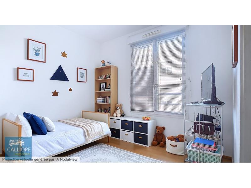 1 entrée avec placard, 1 séjour avec coin cuisine aménagé, 2 chambres de 9.91 m2 et 9.40 m2 avec placards en plus, 1 bureau de 7.84 m2, 1 salle de bains de 3.57 m2, 1 wc. 1 balcon avec vue sur parc de 7 m2.