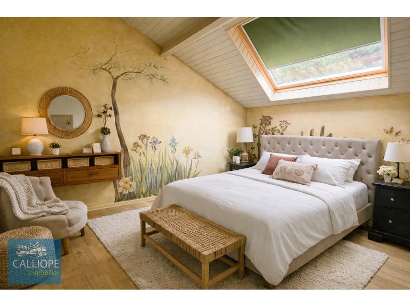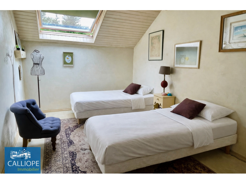 Quelques marches mènent à une mezzanine aménagée en coin lecture, desservant deux belles chambres de 13 m2 et 15 m2, une salle de bains et des toilettes indépendants.