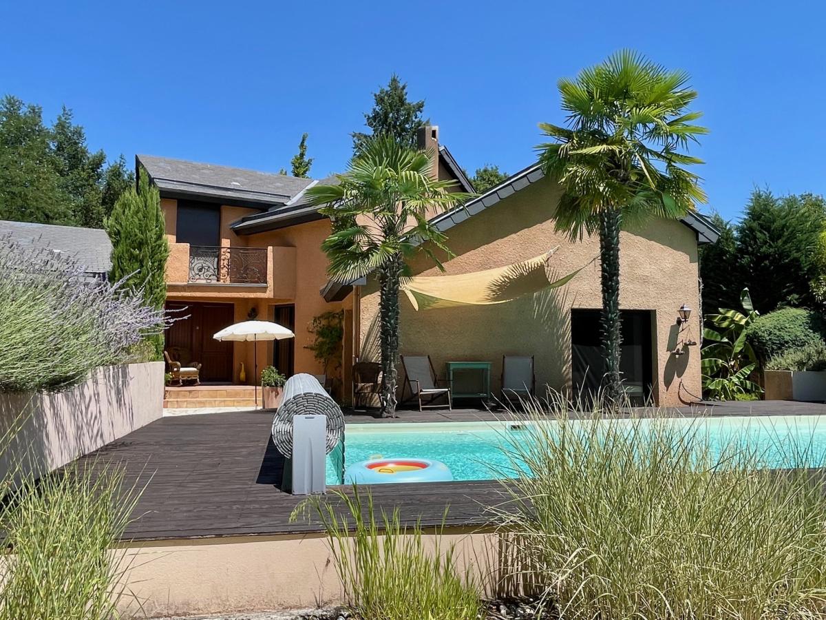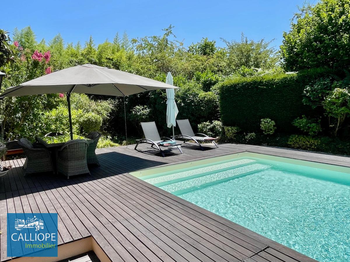 À l'extérieur, vous profitez d'un magnifique terrain arboré de 1 815 m2 sans vis-à-vis, d'une piscine 10x4 sécurisée et chauffée, ainsi que d'un grand garage de 30 m2.