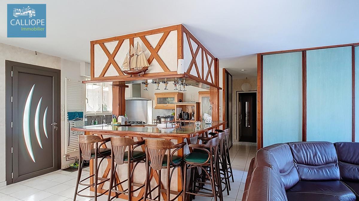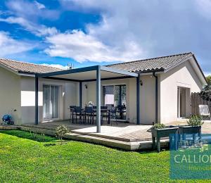 Très jolie maison entretenue avec soins de 117 m2 habitables composée d'un vaste séjour avec cuisine US équipée de 60 m2 et une cheminée, un grand cellier, 3 chambres et une salle de bains. Chauffage électrique et clim réversible. Double vitrage et volets alu. Les plus :